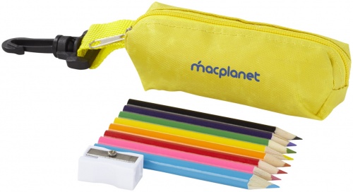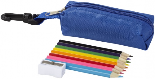 OPIS: 8-elementowy zestaw kredek. 8 kolorowych kredek i temperówka w poliestrowym zapinanym futerale z klipsem. Poliester.