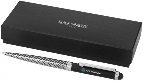 OPIS: Długopis ze stylusem Empire. Długopis ze stylusem ze stylowym wzorem na dolnej części korpusu. Zawiera wysokiej jakości niebieski wkład. Zapakowany w pudełko upominkowe Balmain. Wzór zastrzeżony. Metal.