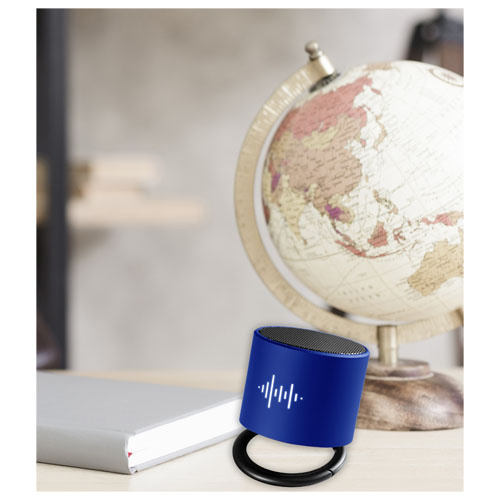 OPIS: Bezprzewodowy głośnik Bluetooth® o mocy 3W z podświetlanym logo oraz podwójnym wyjściem dźwięku dla niezrównanej jakości brzmienia jak na głośnik tego rozmiaru. Głośnik można odchylić, aby skierować dźwięk w dowolnym kierunku. Posiada wbudowany mikrofon i funkcję połączeń konferencyjnych. Pojemność: Bateria o pojemności 500 mAh - 3,7 V. Częstotliwość: 50 Hz - 20 KHz. Moc dźwięku: 1 x 3 W. Impedancja: 4 Ω. Bluetooth® 4.2. Waga netto: 100 gramów. Wymiary: ∅ 50 mm x 45 mm. W zestawie znajduje się pudełko upominkowe z magnetycznym zamknięciem wykonane z papieru z recyklingu.