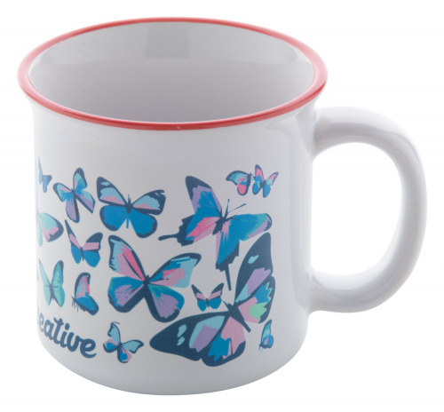 OPIS: Kubek ceramiczny w stylu vintage z kolorową obwódką, pod sublimację. 300 ml. Pakowany jednostkowo w kartonik.
