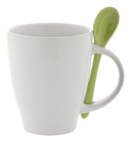OPIS: Biały ceramiczny kubek z kolorową, ceramiczną łyżeczką, 300 ml.