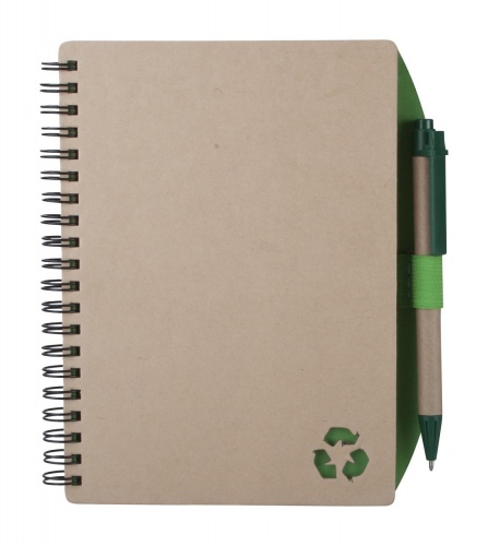 OPIS: Notatnik na spirali z 80 kartkami w linie, w zestawie długopis ekologiczny dobrany kolorystycznie.