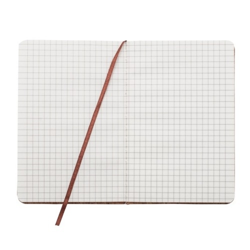 OPIS: Notes o formacie A6 oprawiony w okładkę z gładkiego korka. 80 kartek w kratkę 70 g/m². Zamykany elastyczną taśmą. Papier kremowy chamois.