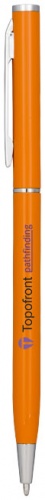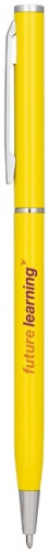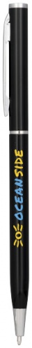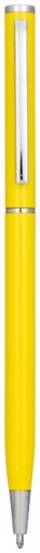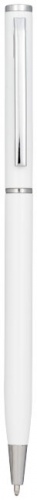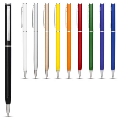 OPIS: Ultra smukły wykonany z aluminium długopis. Slim aluminiowy długopis glazurowany, z mechanizmem włącz/wyłącz obrotowym typu twister. Klips w tym modelu zawsze srebrny błyszczący. Na korpusie pierścień srebrny dzielący rurkę na dwie części. Aluminium.