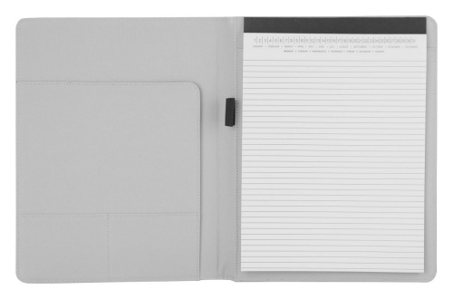 OPIS: Elegancka teczka na dokumenty A4 posiada notatnik z 20 stronami w linie. Całość zamykana na podwójną, kontrastującą, białą gumkę z metalową plakietką. Wewnątrz jest elastyczna pętelka na długopis, duża kieszeń płaska na luźne arkusze papieru oraz kieszonki na wizytówki. Kolorystyka: na ZEWNĄTRZ CZARNY, wewnątrz SZARNY (patrz zdjęcia w galerii). Poliester 600D.