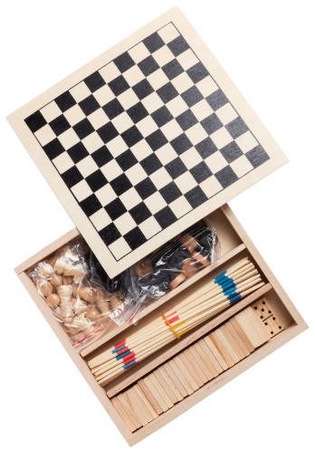 OPIS: Drewniany zestaw gier zawierający: szachy, domino, mikado i bierki wszystko zapakowane w drewniane pudełko z wysuwanym wieczkiem. Praktyczna wieloraka rozrywka zawsze pod ręką z miejscem na reklamę. To uroczy nośnik promocji!