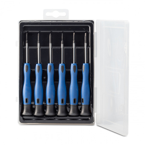 OPIS: Zestaw 6 precyzyjnych śrubokrętów w pudełku: PH0*50mm, PH00*50mm, PH1*50mm, SL1.4*50mm, SL2.5*50mm, SL3.0*50mm. UWAGI: w zestawie wkrętak płaski, wkretak Phillips (krzyżowy), magnetyczne groty wkrętaków